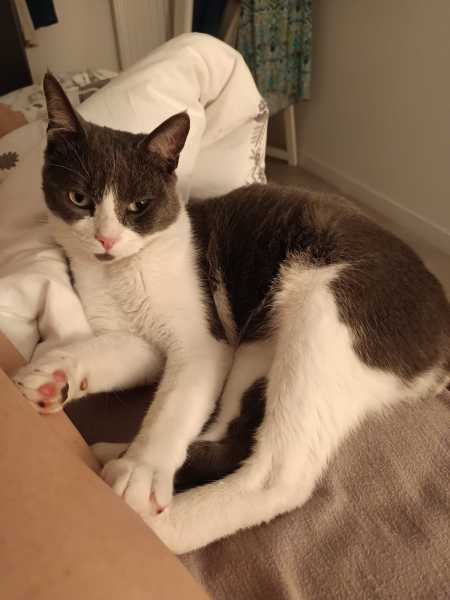 Jeune chat timide le jour, mais câlin et proche de l'humain le soir sur le lit ou le canapé. Une famille calme et patiente fera son bonheur.